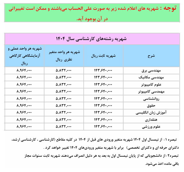 شهریه سال تحصیلی 1405-1404 پردیس بین الملل دانشگاه شیراز به شرح زیر است: